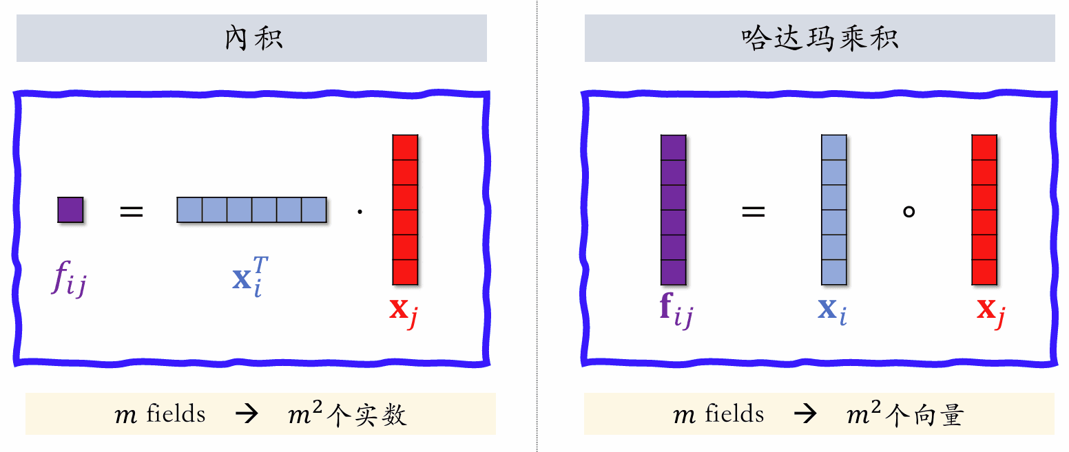 xiTx^T_ixjx_j 都是特征的 embedding 向量,fijf_{ij} 是一个向量,如果有 mm 个 field,他们之间两两哈达玛乘积,就会有 m2m^2 个向量。量太大,需要人工指定一部分向量做交叉,而不是所有向量都交叉。